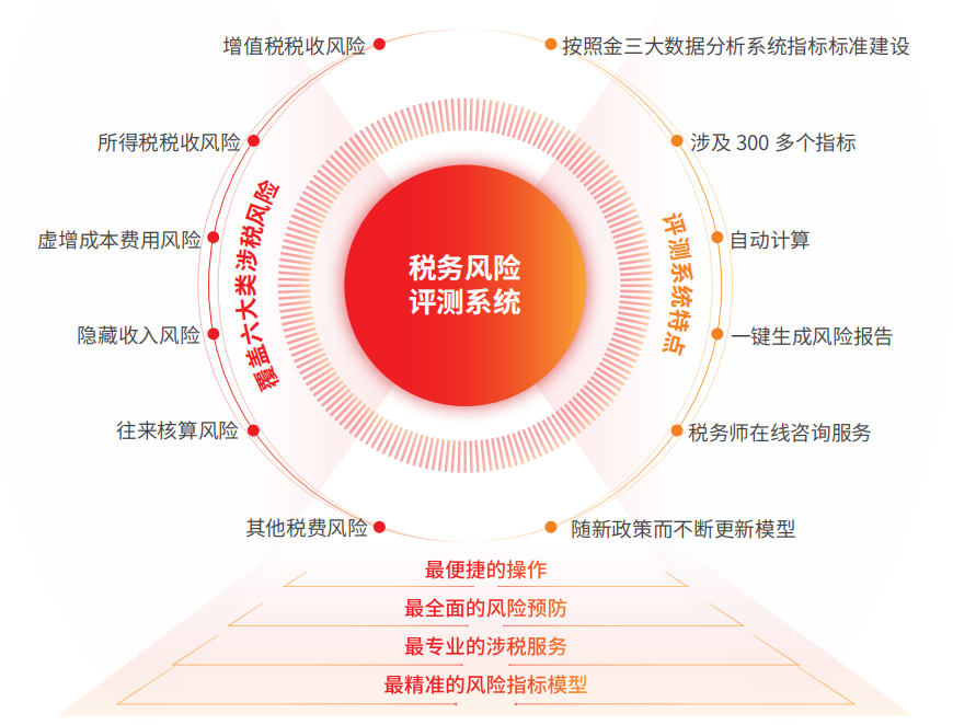 用友公司根据金税三期大数据分析模型,推出了“税务风险评测系统”,企业可以在每个月结账前通过税务风控 300 余个指标进行自查, 系统自动出具税务风险报告,帮助企业防患于未然。
