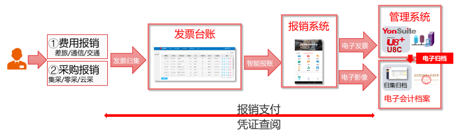 针对电子会计凭证报销入账归档,用友提出了一个一体化的解决方案。通过云服务实现电子发票的验伪防重、保存、审批,报销环节智能审批、管控,入账环节,自动生成凭证,并将所有的电子信息储存到电子会计档案平台。