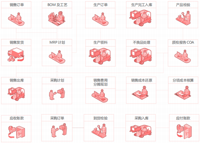 • 销售接单后,计划部门进行生产计划安排,MRP 运算出对应销售订单的采购计划、生产计划。