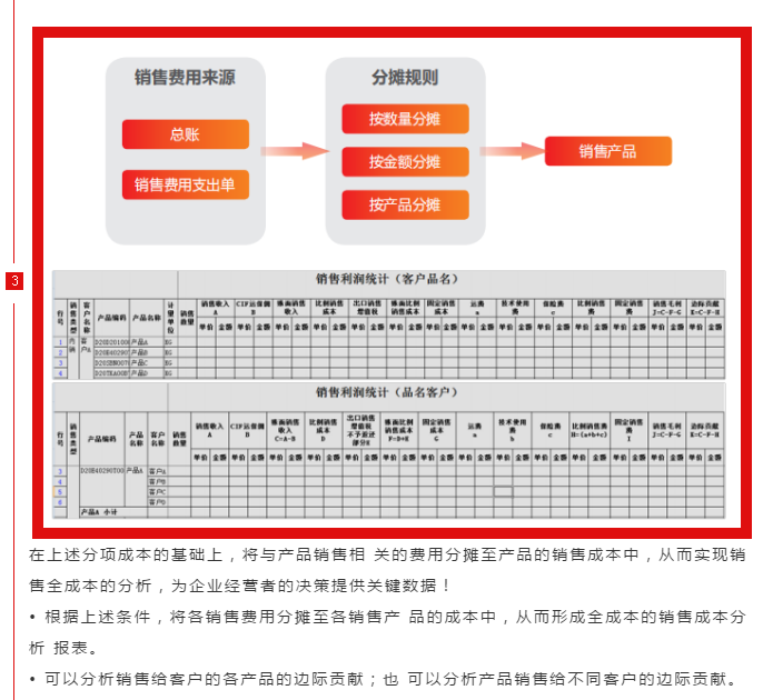 • 定义各销售费用的取数逻辑、分摊至产品的规则,通过开发手段计算出产品的销售毛利及边际贡献率。