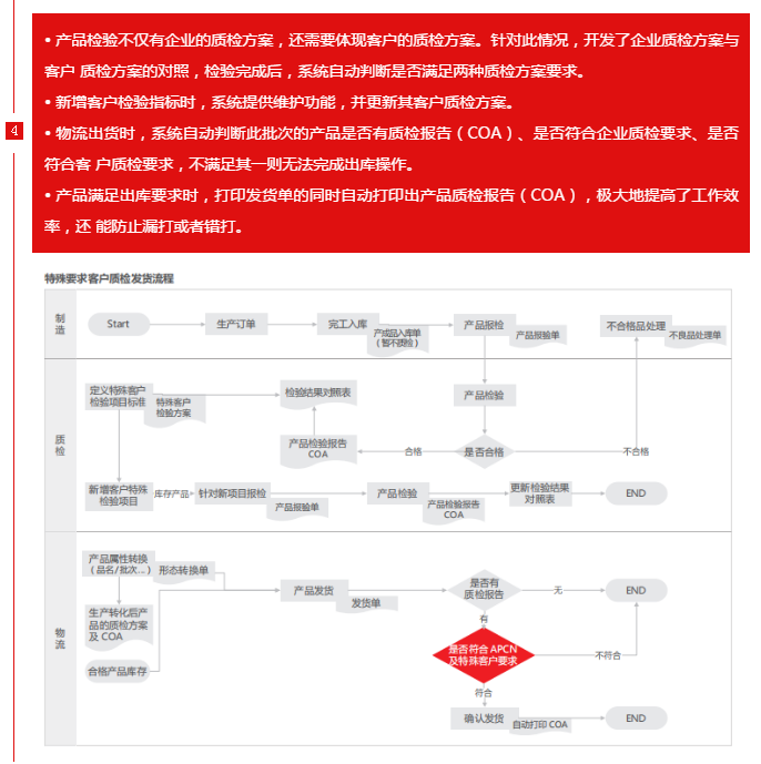 • 产品质检:只有合格的产品批次才能进行发货,发货时自动打印产品质检报告(COA);不合格产品转到不良品处理流程。