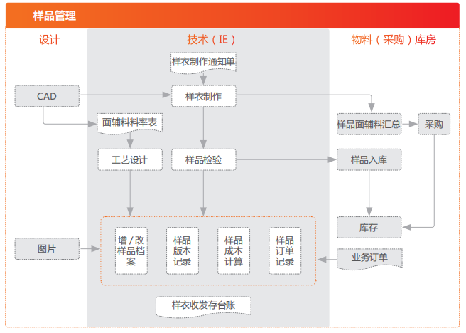 • 由于企业主要依据客户来样生产,样品管理是其中一环,需要对于样品的物料、工艺、图片等资料的全面管理。