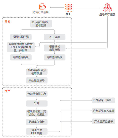 销售接单后,根据客户对电缆不同长度的要求,最大 化利用仓库中的现有库存,根据库存盘号信息,指导销售 订单配盘;同时自动产生出入库单,减少人工操作。