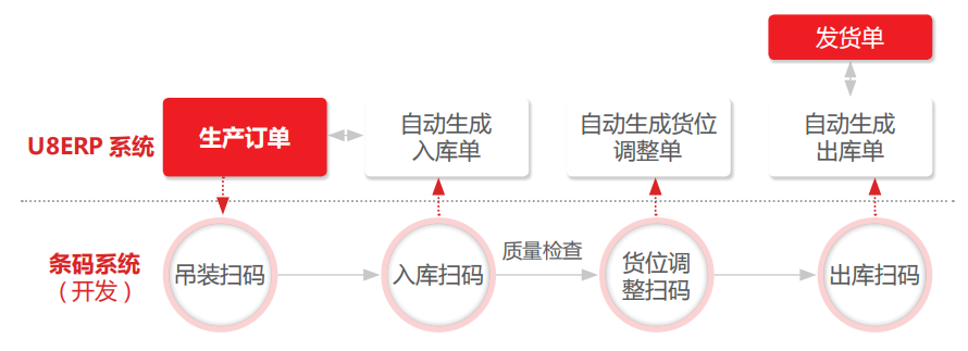 丽驰汽车下达生产订单后,条码系统会自动接收生产订单信息,并在吊装上线时,采用一车一码的方式进行管理,当生 产下线时,通过PDA扫码自动生成U8+产品入库单;质检完成时,同样通过PDA扫码,自动生成U8+的货位调整单,发 货时,依据U8+发货单,通过条码系统,自动生成U8+的出库单,简单操作,产品配置、颜色等信息准确无误,且在发 货现场、质检现场可通过PDA直接完成业务操作。