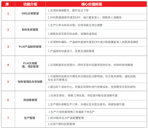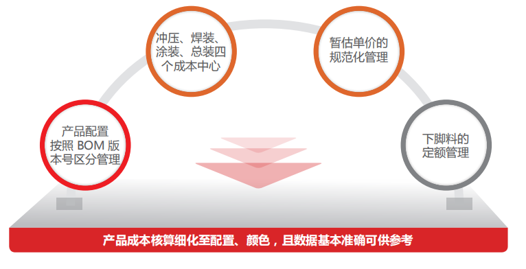 丽驰汽车按照四大工艺流程分别成立四个成本中心,分别是冲压、焊装、涂装及总装;同时将产品的不同配置通过BOM 版本管理来区分,暂估单价的规范化管理使得存货结存成本更接近于实际成本,最终自动卷积计算出产品的不同配置、 不同颜色的成本数据。