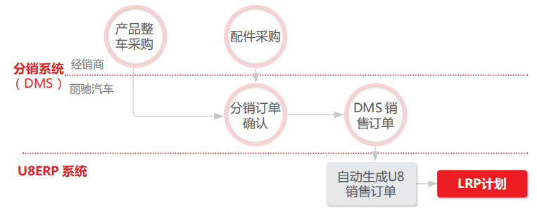 丽驰汽车的销售模式采用经销商销售,经销商可通过分销系统(软件开发)选择需要采购的产品,实现销售订单信息的 自主下达,丽驰汽车订单管理员进行确认后,可直接生成U8销售订单,不需二次录入,同时能保证销售数据的准确无误。
