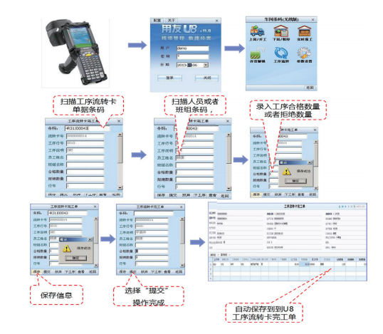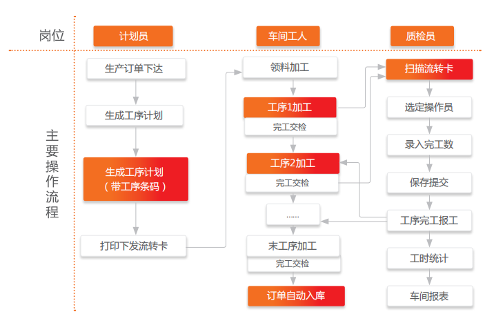 车间管理环节,使用了无线条码终端进 行数据采集,在每道工序完工进行交 检、报工、转序,以前是手工的单据交 专人进行统计,但工人经常不及时报 工,导致当月的工时统计不准确、不及 时;现在使用条码扫码后,可以作到数 据实时采集、进度实时掌控、现场实时 监督、业务实时分析。