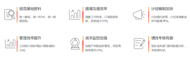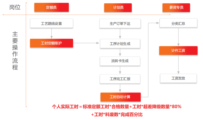 前期设好各工序的工时定额,完工汇报后,由系统自动计算实际工时,各个工人的计件工资就快速算出来了,效率极高,也几 乎没有错误,员工满意度提高。