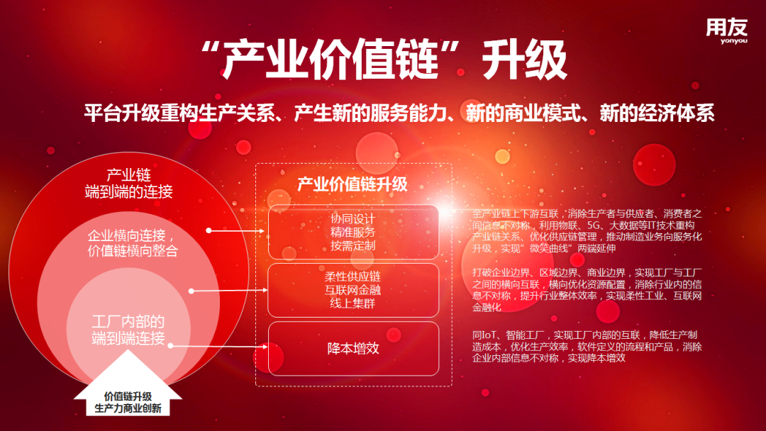 市场需求疲软、进出口受挫、供应链配套协同不力…疫情是对企业竞争力的一次模拟考试,也是淘汰落后生产模式的契机,成长型企业该如何渡过?用友网络助理总裁孙汉明为我们介绍:经济和技术环境的变化,对企业精细管理、成本控制、精准分析、在线业务协同的能力,有了更高的要求。打造数智化平台,实现数智化平台升级,从而实现价值链升级,是企业升级转型的必然选择,也是企业构建未来核心竞争力的最优路径。用友U8作为成长型企业数智化转型的支撑平台,通过连接升级、运营升级、产业价值链升级实现数智化平台升级向产业价值链的全面升级。