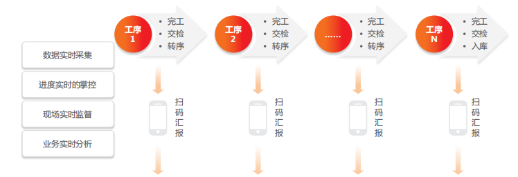 计划部门下达生产任务到各生产车间,车间管理人员生成工序计划,根据工序计划生成工序流转卡,根据流转进行工序领 料,通过条码实现工序报工、工序检验以及完工入库。加工进度实时掌握,质量问题全流程可追溯,随时掌握各生产线各工 序的在制情况,强化车间过程管控,推动车间管理升级。
