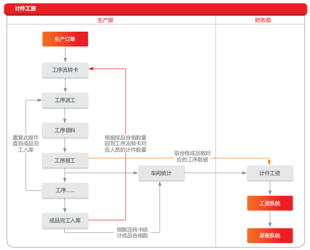 根据车间条码进行工序报工,系统自动统计各工序的报废数量、合格入库数量。根据各工序的完工入库的合格数量,系 统自动计算出各工序各人员的计件工资。汇总后自动传递到工资系统,进行工资计算和发放,并生成凭证传递到总账系统。
