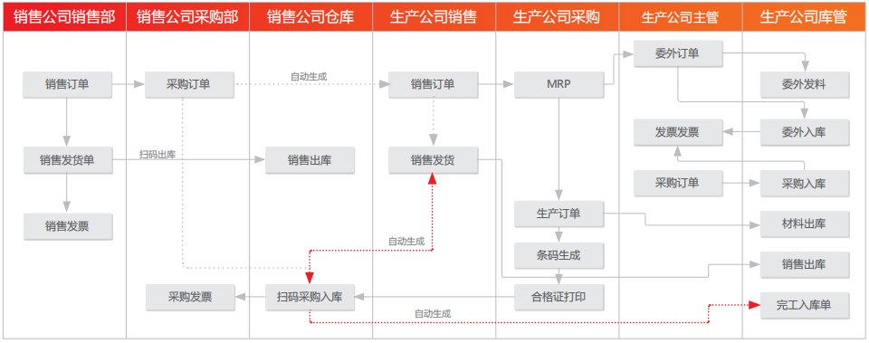 • 系统根据销售公司的采购订单,自动产生面向销售公司的销售订单,销售订单号带入对应采购订单号码做业务穿透的线索;