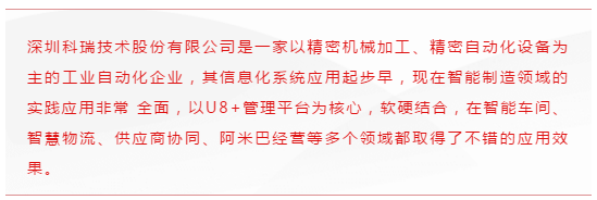 通过多年的合作与发展,我们很高兴的看到科瑞与我们的伙伴以 U8+ 应用实践为前提,在智 能制造、智能仓储等领域构建了一个软硬一体化的智能管理模式,为支撑科瑞的快速扩张发展打 下了良好基础。