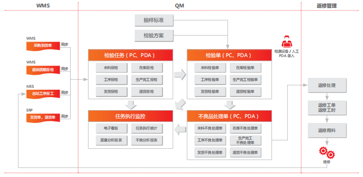 • 工序 / 完工检验:现场扫码检验,实现不良品处理、返工流程、返工单闭环集成处理。