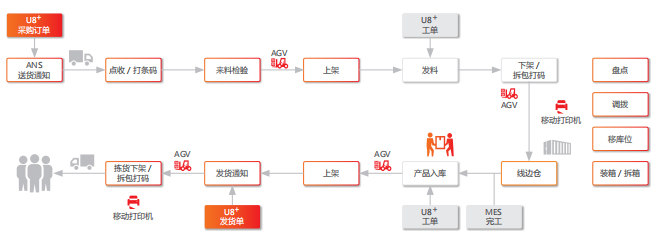 • 通过条码技术集成 WMS 仓库收、发作业条码扫码生单自动同步到 U8+,结合先进先出与拣货货位智能计算、智能拆包应用,提升出 入库操作效率,并加强防呆防错。