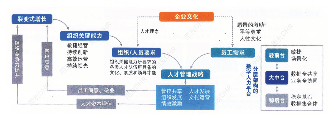 共生型组织必然是平台型组织,平台型组织依赖人力资源业务中台构建数字人才体系,将组织目标或生态战略以及对应的组织关键能力、组织的文化和基因属性,形成人才 管理战略,构建快速响应的轻量级前台(华为的眼镜蛇组织模式或铁三角组织模式),资源组合、人才供应和流程驱动的大中台(数据全功效、业务全协同),稳定的后台(包括数据集成、外部应用基础、数据集合体、管控体系等),进而使人力资本增值,提升员工满意度和组织竞争力。