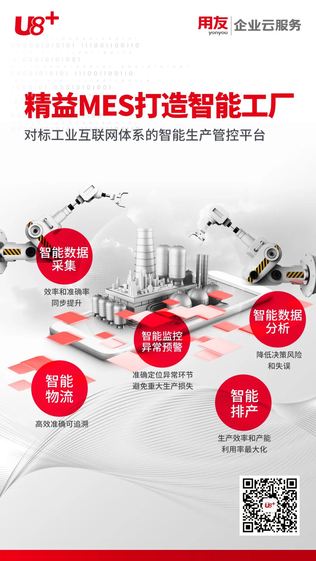 U8+ MES 智能工厂采用最新信息技术和网络技术,并结合JIT精益生产、智能制造管理理念,实现了 ERP数据共享、业务协同、与底层自动化 设备的 PLC/SCADA 等系统打通,MES对车间人、机、料、法、环、质等生产要素进行全面管控,打造数字化生产车间,实现车间生产的全过程可视化管理以及成本核算的精细化管理,打造智能化数字工厂。