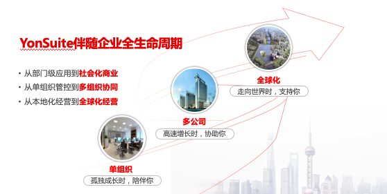 有温度、愿意与企业共情的YonSuite,陪伴企业成长的每一个阶段:当企业处于创业期,孤独成长的时候,YonSuite陪伴你;当企业处于多公司,高速增长的时候,YonSuite协助你;当企业成为全球化公司,走向世界的时候,YonSuite支持你。陪伴企业成长,让商业创新简单便捷,这个就是YonSuite在设计之初的核心理念。