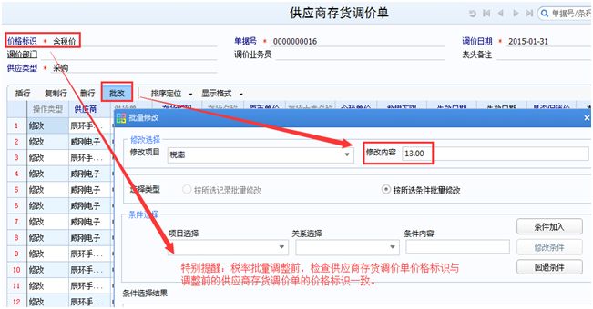 以上相关档案税率均可在档案列表上通过批改来调整,关于“供应商价格表”批改则为: