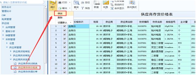 Step1:打开供应商存货价格表,点击【修改】按钮,勾选需要调整的价格表。