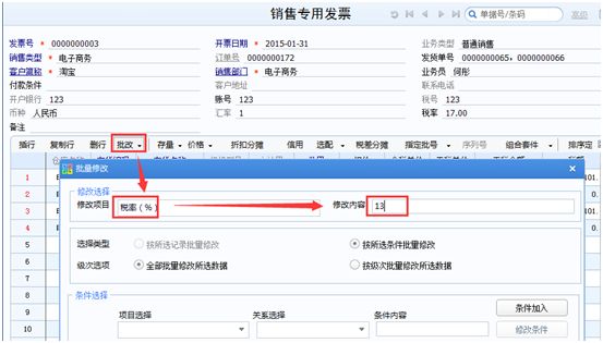 Step2:点击【批改】按钮,录入修改项目税率,录入调整后的税率,点击【确定】执行完成。