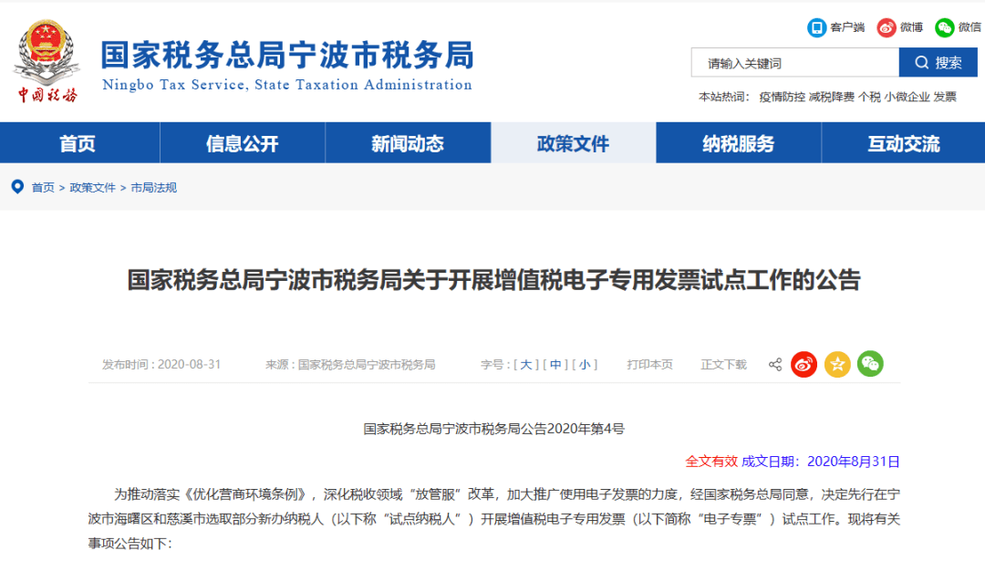 国家税务总局宁波市税务局公告2020年第4号,关于开展增值税电子专用发票试点工作的公告明确:为推动落实《优化营商环境条例》,深化税收领域“放管服”改革,加大推广使用电子发票的力度,经国家税务总局同意,决定先行在宁波市海曙区和慈溪市选取部分新办纳税人开展增值税电子专用发票试点工作。该公告自2020年9月1日起施行。