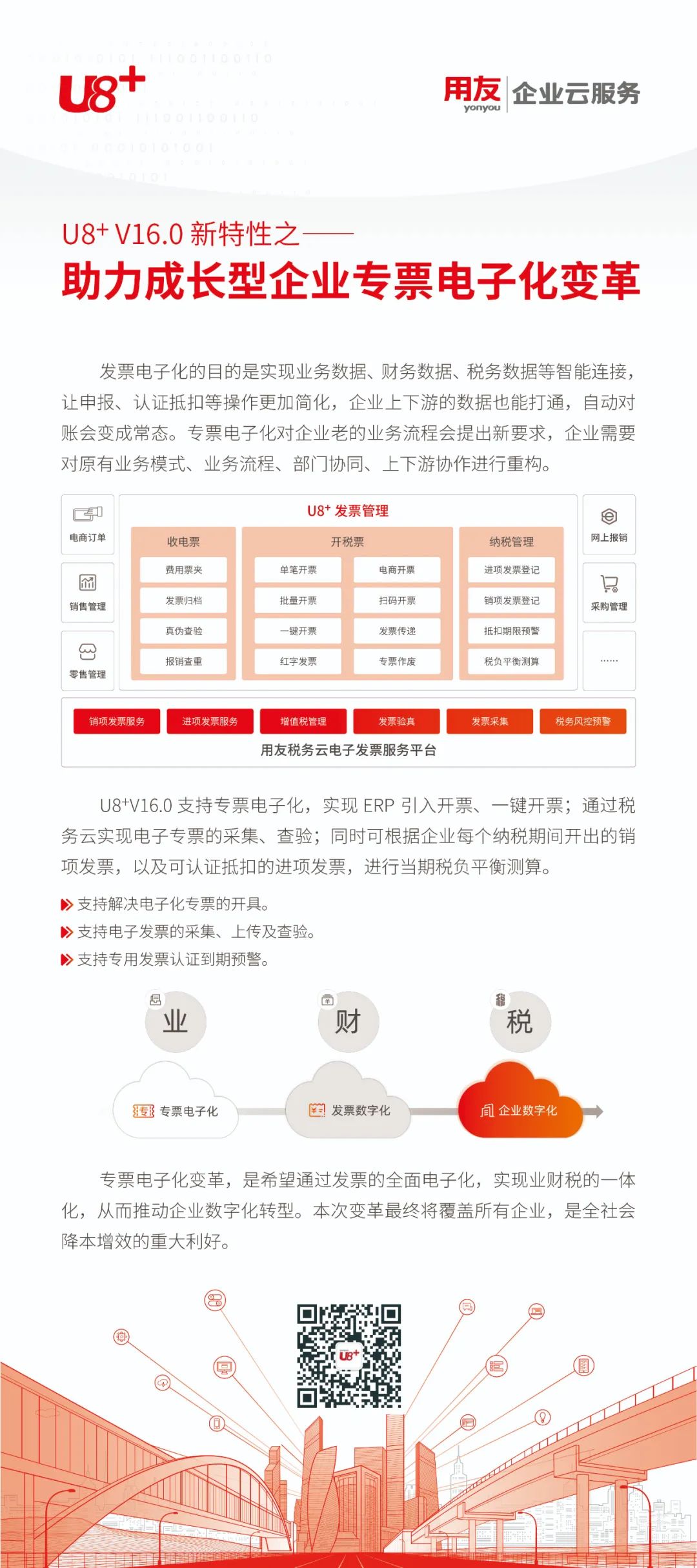 专票电子化的目的不仅是“以票控账,以票审计,以票查税”,更是推动成长型企业数字化转型的重要契机。用友U8+专票电子化解决方案充分挖掘用友在企业服务市场多年积累的经验和能力,打通业务、财务、税务一体化处理流程,发挥专票电子化带来的数据驱动优势,帮助企业真正将发票为代表的数据资源利用起来。