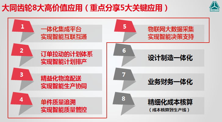 五,智能感知、动态监控、实时分析,实现智能决策支持。采用智能感知技术,如条码扫描枪、智能手持终端、工业互联网平板,实现整个数据实时采集与实时反馈,以及实时传递。目前大同齿轮在137条生产线上,1209个工位,应用了350个智能终端,1300台数字化设备,可查看产线运行状态、单机运行效率、设备实时状态等。