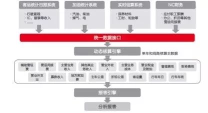 首先建立单车核算项目应用主数据;进行业务处理时,通过统一数据接口采集公交集团现有系统数据;然后通过动态核算引擎,对采集数据分摊规则进行分摊,形成以单车为归集对象的单车收入、成本数据;在此基础上,分别形成单车、线路、车队、运营公司、集团公司收入、成本利润表;再根据管理和决策方面需求,生成相关统计分析报表。