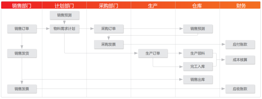 • 财务部门根据业务部门处理的业务,进行成本核算,并出具财务报表。