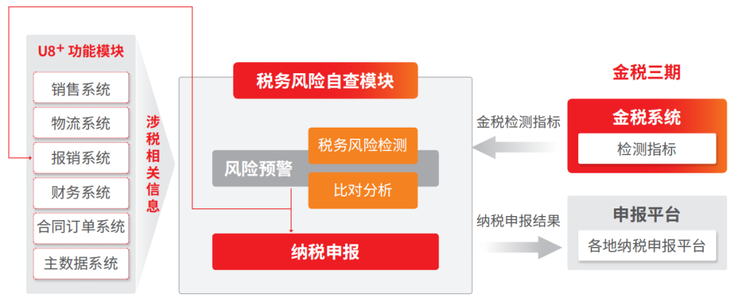连接融合 U8+、税务云,实现“云 + 端”税务风险管控的一体化应用, 实现基于企业纳税申报表的税务风险预警、纳税申报表比对分析。