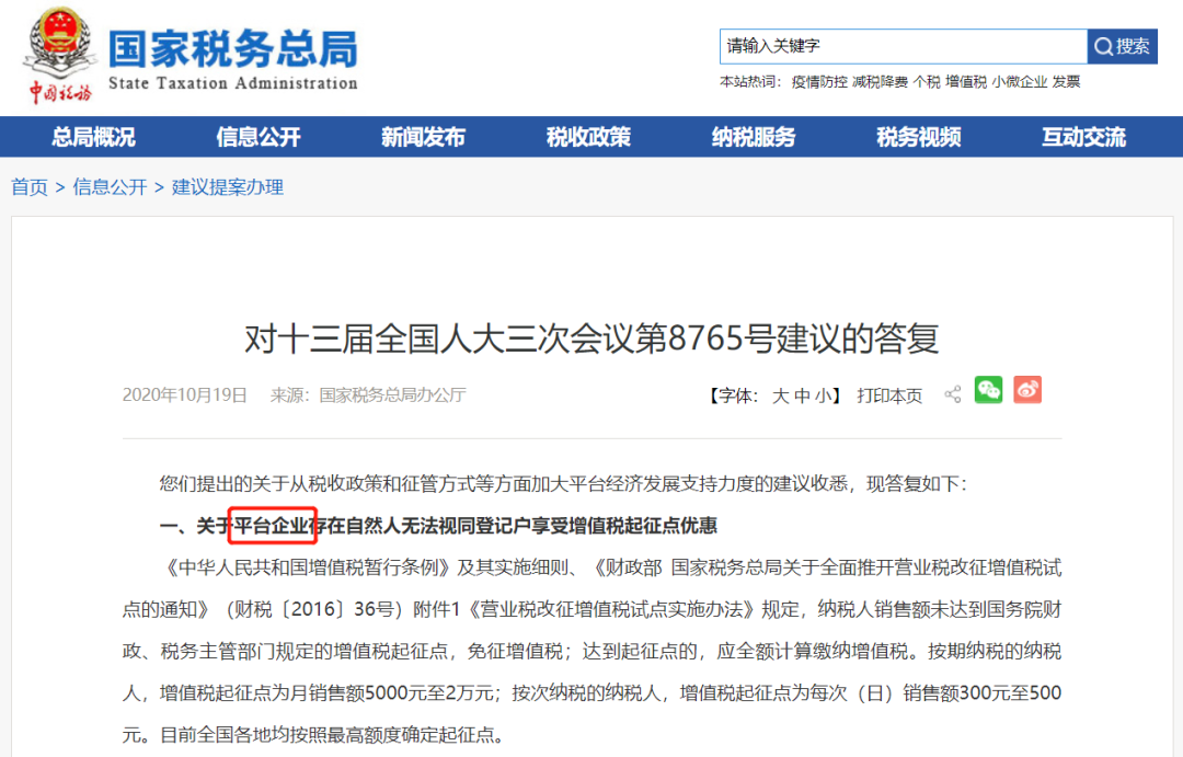 近日,国家税务总局对十三届人大三次会议第8765号建议进行了答复。