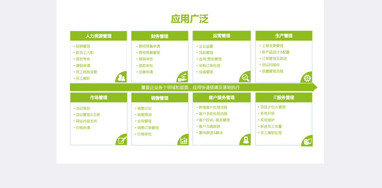 智能定制,随需而变。快速封装人力资源管理、资产管理、财务管理、hr管理、生产管理、销售管理等业务模块。满足企业对复杂业务流程处理需求。