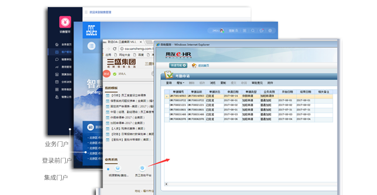 门户全息呈现:按角色/应用/职能的不同门户设置;预置门户模板,拿来即用;PC/移动/大屏